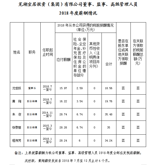 市宜居公司企業(yè)負責人2018年度薪酬情況