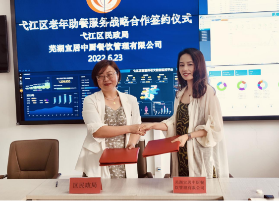6月23日下午,蕪湖宜居中廚餐飲管理有限公司與弋江區(qū)民政局正式簽署了老年助餐服務(wù)戰(zhàn)略合作協(xié)議,市民政局副局長(zhǎng)王峰、弋江區(qū)民政局局長(zhǎng)孫亞敏、弋江區(qū)民政局副局長(zhǎng)曹存明、宜居博覽公司總經(jīng)理王次武、宜居中廚公司總經(jīng)理邢維丹出席了簽約儀式。