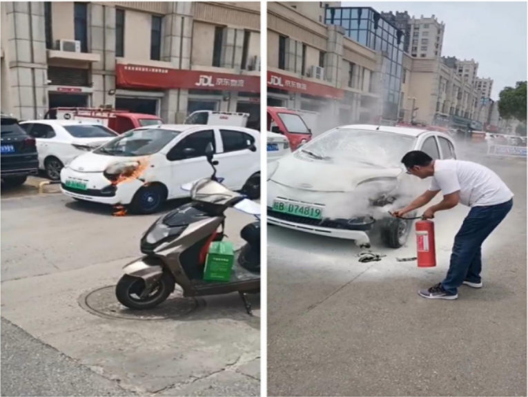夏至已至,盛夏伊始,在酷暑天氣下,各類涉電用品易高溫自燃,引發(fā)火災(zāi)。6月27日中午1點(diǎn),一輛新能源汽車行駛至赤鑄山路社區(qū)附近時(shí),引擎蓋突然起火自燃,且周圍車輛密集,情況十分危急。