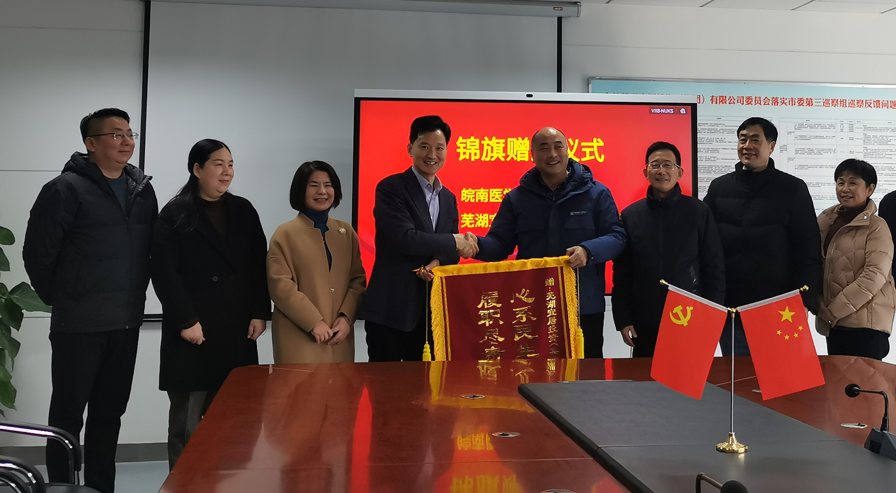 1月18日上午,皖南醫(yī)學(xué)院弋磯山醫(yī)院給集團(tuán)公司贈(zèng)送一面“心系民生 服務(wù)社會(huì) 履職盡責(zé) 不負(fù)重托”的錦旗,向公司對(duì)皖南醫(yī)學(xué)院弋磯山醫(yī)院醫(yī)療項(xiàng)目安徽省公共衛(wèi)生臨床中心(蕪湖)項(xiàng)目、首都醫(yī)科大學(xué)附屬北京天壇醫(yī)院安徽醫(yī)院項(xiàng)目的大力支持、傾情奉獻(xiàn)表示衷心的謝意。皖南醫(yī)學(xué)院弋磯山醫(yī)院黨委書記陳曉宏、院長朱向明、副院長江曉春、公共衛(wèi)生臨床中心北區(qū)工作專班副組長查曉娟,集團(tuán)公司黨委書記、董事長沈世躍、黨委專職副書記姚菁、副總經(jīng)理徐玲、金暉宜江公司董事長后宗斌參加贈(zèng)送錦旗儀式。