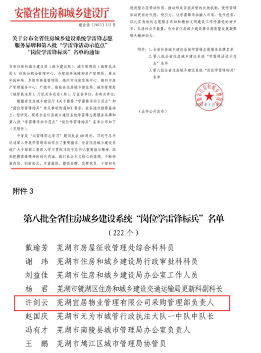近日,安徽省住房和城鄉(xiāng)建設廳印發(fā)《關于公布全省住房城鄉(xiāng)建設系統(tǒng)學雷鋒志愿服務品牌和第八批“學雷鋒活動示范點”“崗位學雷鋒標兵”名單的通知》。宜居物業(yè)公司采購管理部負責人許劍云同志獲評“崗位學雷鋒標兵”。