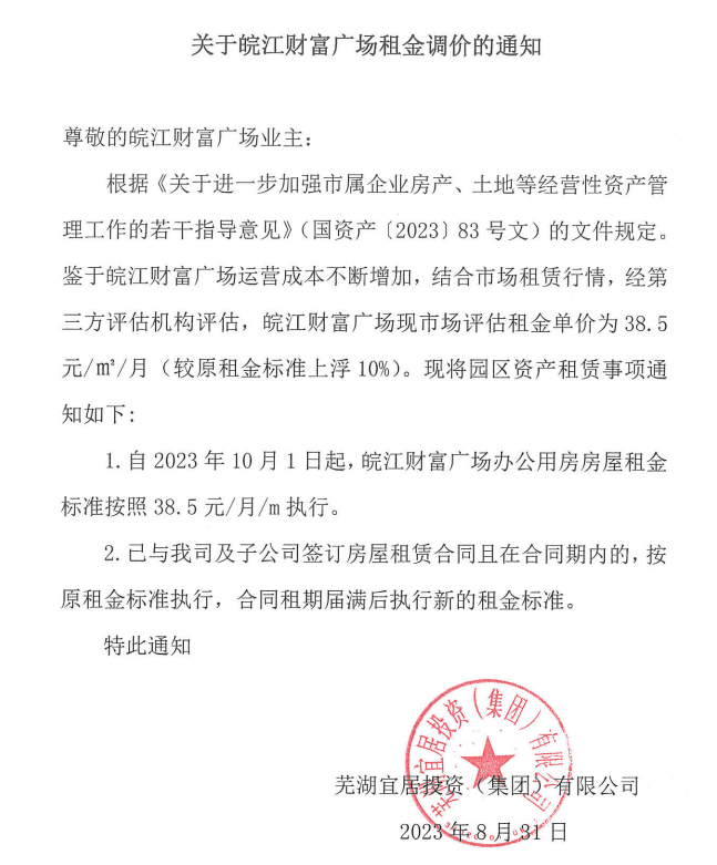 關(guān)于皖江財(cái)富廣場租金調(diào)價(jià)的通知