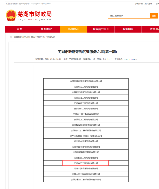 2023年9月8日,蕪湖宜正工程咨詢有限公司(以下簡(jiǎn)稱“宜正公司”)榮獲市財(cái)政局第一期“蕪湖市政府采購(gòu)代理服務(wù)之星”。