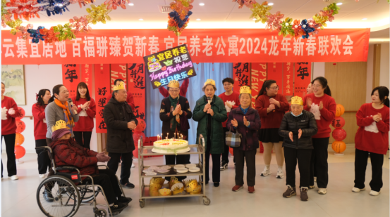聯(lián)歡會(huì)在長者的非洲鼓表演中熱烈開場,蒙古舞熱情奔放,時(shí)裝走秀將活動(dòng)氛圍引至高潮。養(yǎng)老公寓各社團(tuán)的老師們?cè)缭谝粋€(gè)月前便與長者們商量策劃活動(dòng)節(jié)目,長者們躍躍欲試、勤加練習(xí),摩拳擦掌要在聯(lián)歡會(huì)上一展所學(xué)。公寓98歲的金奶奶親自作歌詞一首“我在羅蘭小鎮(zhèn)等著你,這里的鳥兒會(huì)唱歌,我在養(yǎng)老公寓歡迎你”。92歲的羅奶奶參加了公寓多個(gè)社團(tuán),上臺(tái)表演了4個(gè)節(jié)目,來到宜居養(yǎng)老公寓后精神矍鑠、心情愉悅,“以前和家人有代溝,來到公寓和同齡人更有共同語言,公寓里經(jīng)常組織各種活動(dòng),不僅不再孤單寂寞,還豐富了我的文娛生活。”表演環(huán)節(jié)結(jié)束后,五心暉映先鋒志愿者為本月過生日的壽星送上生日蛋糕,壽星們與志愿者一起唱生日歌,收獲了滿滿的生日祝福。